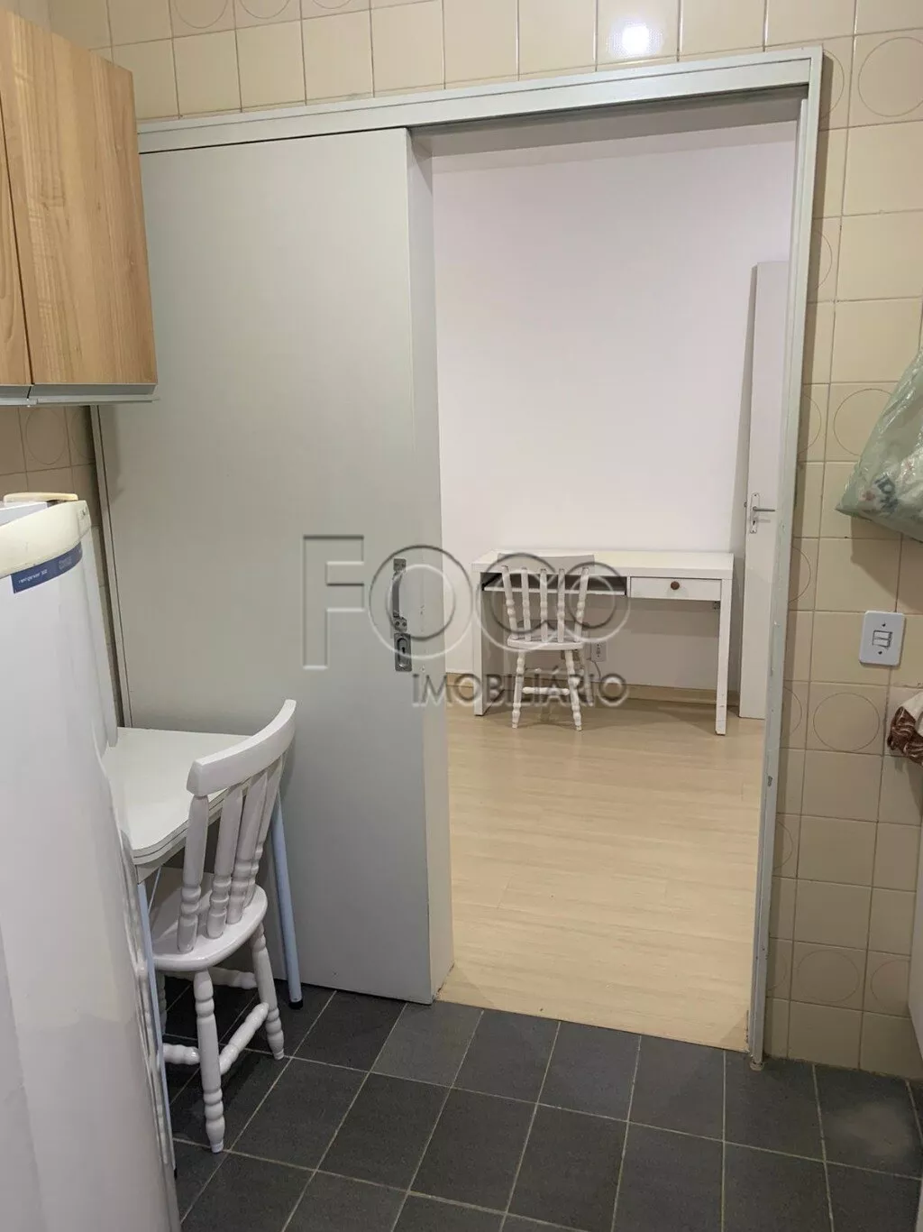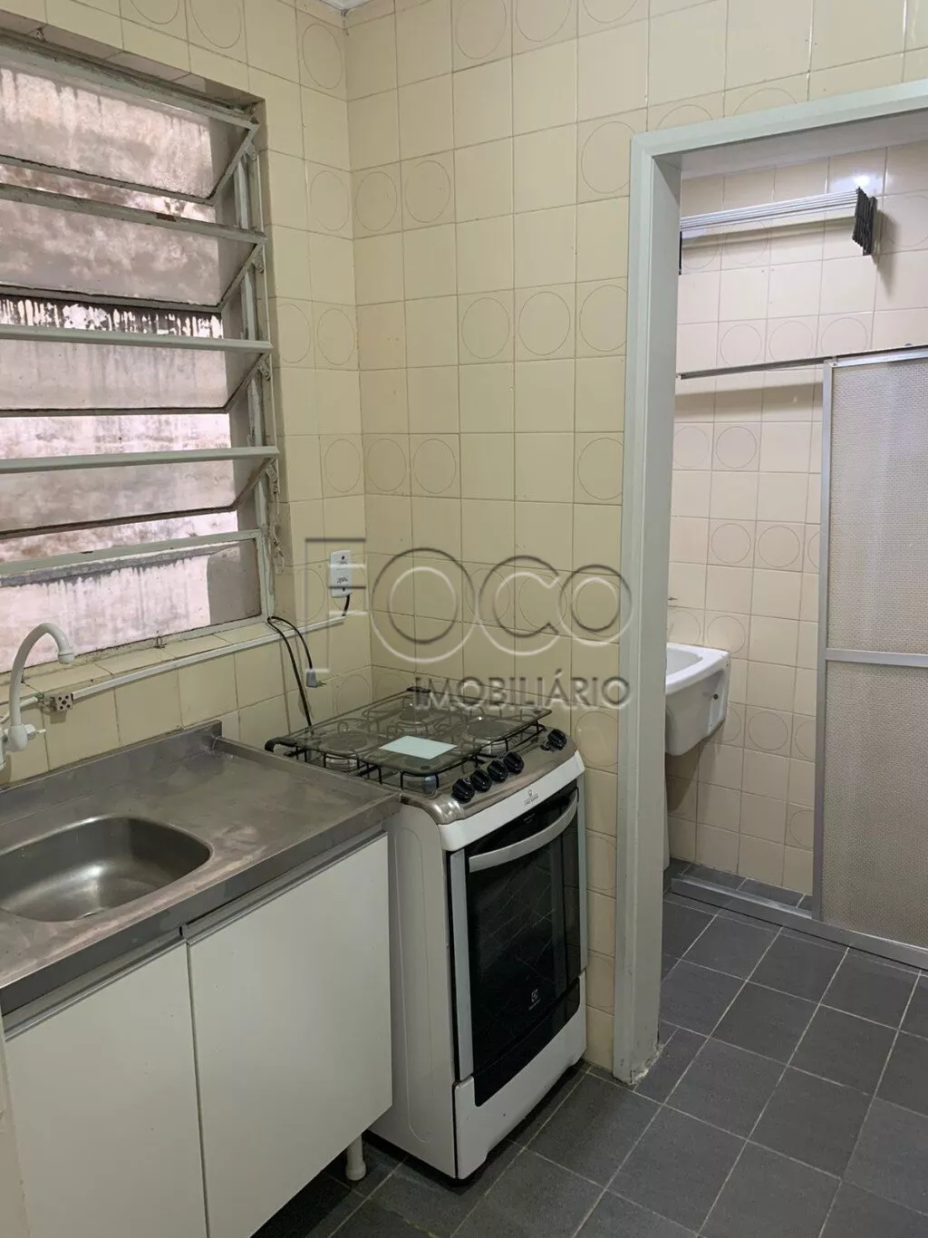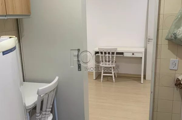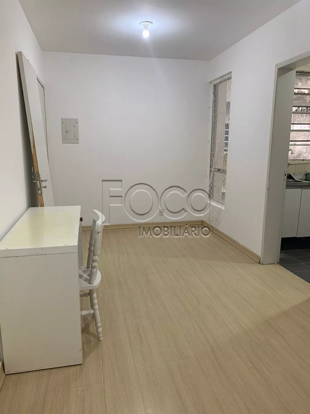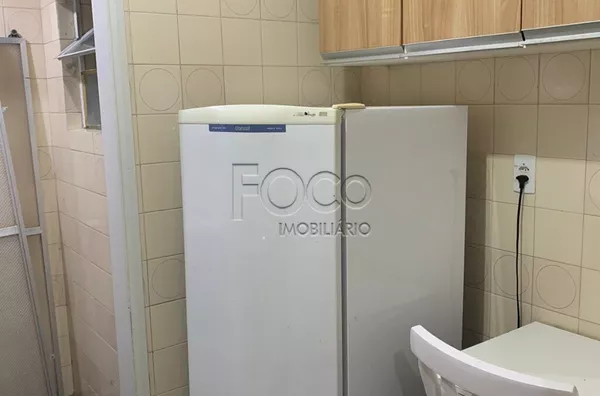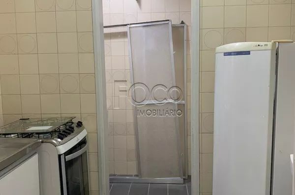 Amplo apartamento de um dormitório na Duque de Caxias, living, cozinha com fogão, geladeira e armários, área de serviço separada, banheiro.