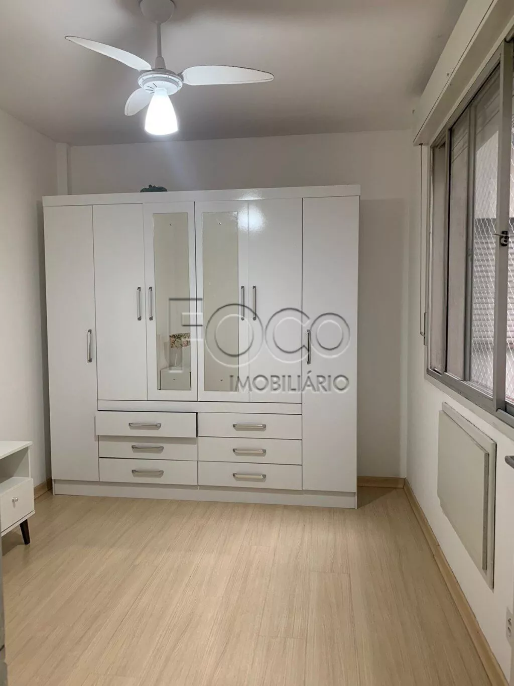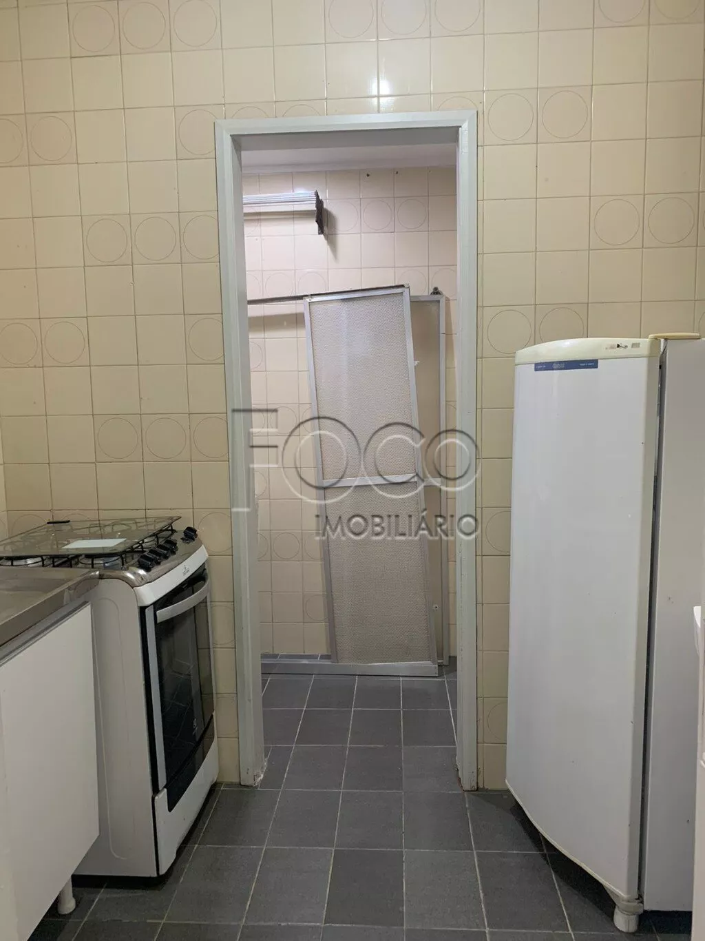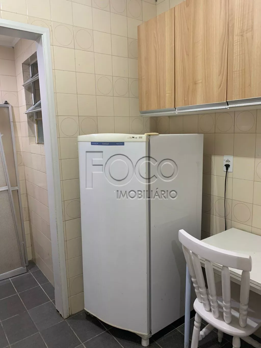 Amplo apartamento de um dormitório na Duque de Caxias, living, cozinha com fogão, geladeira e armários, área de serviço separada, banheiro.