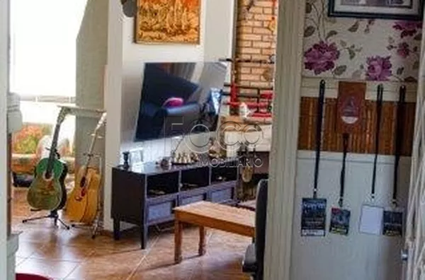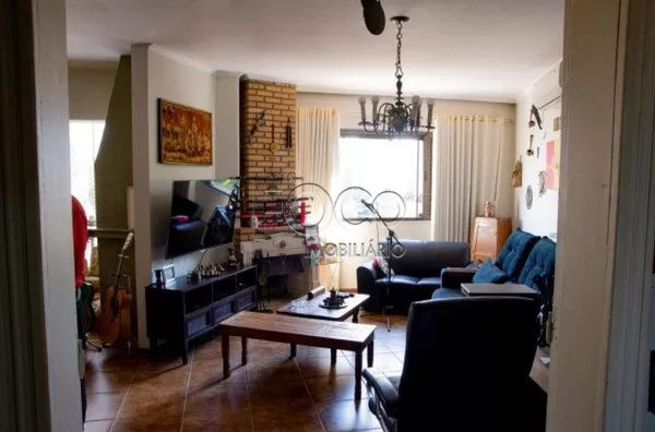 Sala: Tampa da churrasqueira, armário móvel, fogão de ferro (Gás), recipiente para lenha, pia da churrasqueira, lâmpada florescente, lustre e lareira.